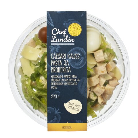 keedetud pasta 32% (vesi, DURUM-NISUJAHU, sool), broilerifilee 15% (broilerifilee 95%, tärklis, dekstroos, lõhna- ja maitseained), MUNA (happesuse regulaator E330), rooma salat, caesari kaste 12% (taimsed õlid (raps,oliiv), SINEP (SINEPISEEMNED, brändiäädikas, vürtsid), kaste (ANŠOOVISE EKSTRAKT), JUUSTUPULBER, MUNAKOLLASEPULBER, äädikas, sidrunimahlakontsentraat, suhkur, küüslaugu lõhna- ja maitseaine, paksendaja E415), KREEKA JOGURT, JUUST, tomat, kapparid, petersell, must pipar