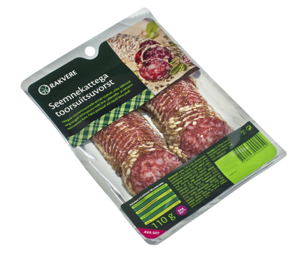 Sealiha (74g sealiha 100g valmistoote kohta), seapekk, veiseliha (23g veiseliha 100g valmistoote kohta), SOJAvalk, sool, hemoglobiin, antioksüdant: E301, lõhna- ja maitseained (sh LAKTOOS), lõhna- ja maitsetugevdajad: E621, E627, E631, dekstroos, happesuse regulaator: E575, toiduvärv: E120, taimne valk, maltodekstriin, stabilisaator: E450, säilitusaine: E250, starterkultuur. Dekoor:linaseemned (2,4%), päevalilleseemned (2,4%), SEESAMISEEMNED (2,4%), želatiin, niiskusesäilitaja: glütseriin, antioksüdant: sidrunhape, säilitusaine: E202.* Toote koostisosade loetelu võib muutuda. Kontrollige enne toote tarbimist pakendil esitatud koostisosi.