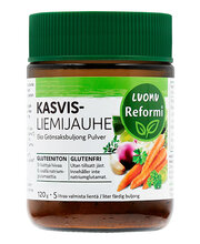 sool, tärklis* (kartul*, mais*), maltodekstriin*, toorroosuhkur*, hüdrolüüsitud rüpsivalk*, glükoosisiirup*, porgand*, porrulauk*, päevalilleõli*, sibul*, pastinaak*, petersell*, kollajuur*, muskaatpähkel*. Aedvilju 3,7%. Võib sisaldada KANAMUNA, SOJA, PIIMA, SELLERI, SINEPI ja SULFITI jääke. * = mahekoostisosad.