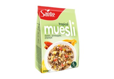 Teraviljad 75% [täisterahelbed , KAER 34%, ODER, NISU, rafineeritud suhkruroog, meresool, linnaseekstrakti , ODER), maisikrõpse (sõmer mais, rafineerimata suhkruroog, meresool, linnaseekstrakti , ODER)], 16% puuviljasegu erinevates proportsioonides [kuivatatud datlid (datlid, riisijahu), suhkrustatud ananass (roosuhkur, ananass, happesuse regulaator: sidrunhape), suhkrustatud papaia (roosuhkur, papaia, happesuse regulaator: sidrunhape)], rafineerimata suhkur suhkruroojahu: ODER, mais, kuumtöötlemata palmirasv, glükoosisiirup, suhkruroo melass, kookoshelbed, meresool, aroom, emulgaator: ( SOJA ) letsitiin , kaneel