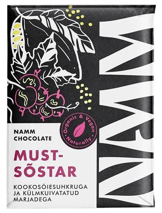 kakaovõi*, kookosõiesuhkur*, INDIA PÄHKEL*, mustsõstar* (10%), kakaopulber*, vanilje*. (*mahepõllumajandusest). Kakao sisaldus vähemalt 42%. Võib sisaldada jääke PÄHKLITEst (metsa-, maa- ja indiapähkel, MANDEL).* Toote koostisosade loetelu võib muutuda. Kontrollige enne toote tarbimist pakendil esitatud koostisosi.