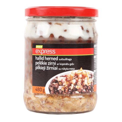 hallid herned 52%, vesi, sibul, suitsutatud sealiha 8% (sealiha 80%, vesi, sool, säilitusaine E250, stabilisaatorid: E451, E407, E425, E415; kartulitärklis, taimsed kiud, vürtsid, dekstroos, antioksüdant E316, modifitseeritud maisitärklis, lõhna- ja maitseaine), searasv, sool