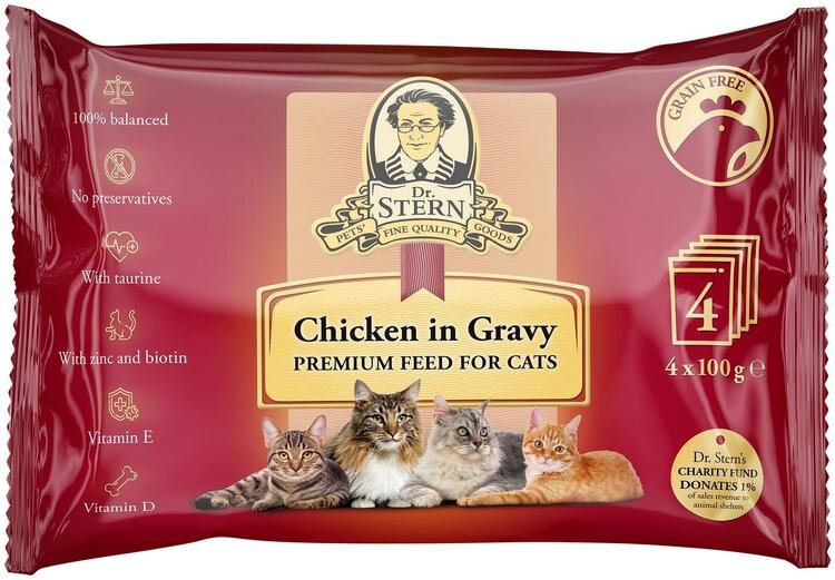 38% Liha ja loomsed derivaadid(34% kanaliha), taimse päritoluga derivaadid, mineraalid, õlid ja rasvad . Analüütiline koostis: toorvalk 8%, toorrasv 4,5%, toortuhk 2,2%, toorkiud 0,3%, niiskus 83% energia 78kcal/100g. Lisandid D3 ja E vitamiin, tauriin, biotiin, tsink, mangaan, vask, jood, raud.