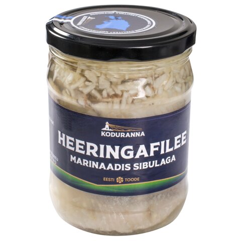 soolatud nahata Atlandi HEERINGAfilee 60% (Clupea harengus harengus), rapsiõli, vesi, sinep (vesi, suhkur, SINEPiseemned, äädikas sool, rapsiõli, toiduvärv (suhkrukulöör), E211, pipar), suhkur, sool, küüslaugupulber, kuivatatud till