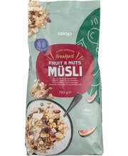 Müsli täisterahelvestest, rosinatest 25%, viigimarjadest 8%,sarapuupähklid 4%, banaanilaastudest 2% ja kookoslaastud 2% 750g