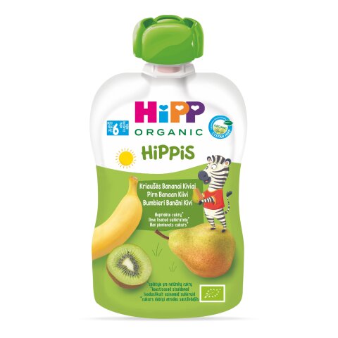 100% puuviljapüree* (pirn* 67%, banaan* 20%, kiivi* 13%). *mahepõllumajandusest. ELi/ELi-väline põllumajandus. AT-BIO-301