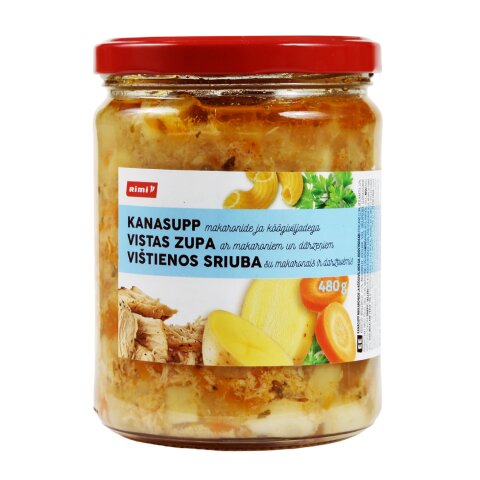 porgand 23,9%, vesi, kartul 22%, keedetud broilerifilee 11,5% (broilerifilee, küüslauk, sool, sibulapulber, glükoosisiirup, pipraekstrakt (must, tšilli)), sibul 11,4%, makaronid 2,9% (kõvaNISUmanna, vesi), rapsiõli, sool, NISUjahu, vürtsisegu (sisaldab SINEPIT), SELLERIjuur, kuivatatud petersell 0,04%. Kanaliha päritolu: EL. Köögiviljade päritolu: EL ja muu kui EL