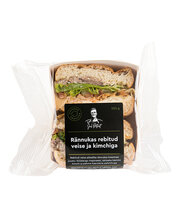 karoteen), säilitusained (kaaliumsorbaat, naatriumbensoaat), stabilisaator (ksantaankummi), SINEPI lõhna-ja maitseaine), JUUST, küüslauk, SEESAMISEEMNED, sool], veise põseliha 18% (veise põseliha, sool, must pipar, rosmariin, tüümian, küüslauk, sibul), tomat, Kimchi 7% [hiina kapsas, sool, valge redis, õun, porgand, valge sibul, roheline sibul, Korea jahvatatud tšilli, KALAkaste (ANŠOOVISE ekstrakt (KALA) (60%), sool, suhkur, happesuse regulaator sidrunhape), õunaäädikas, küüslauk, ingver], marineeritud võileivakurk (kurk, joogivesi, suhkur, happesuse regulator: äädikhape, sool, tardaine: kaltsiumkloriid, lõhna- ja maitseained), jääsalat
