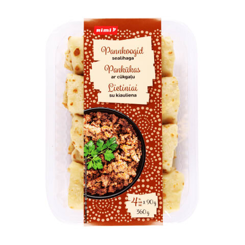 pannkoogid 66,7% (toorPIIM, NISUjahu, MUNAmass, rafineeritud rapsiõli, suhkur, sool, kergitusaine E500(ii), happesuse regulaator E330), praetud sealiha täidis 33,3% (praetud sealiha 86,7%, sibulad, porgandid, rapsiõli, sool, kuivatatud köögiviljade ja vürtside segu (petersell, kartulitärklis, kurkum, ingver, must pipar, porgand, pastinaak, sibulad, küüslauk, till, rapsiõli), must pipar, vesi)