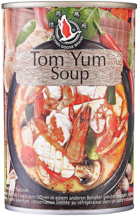 Vesi, kookospiim, seened, tom yum pasta (sidrunhein, tšillipasta (SOJAoad, šalottsibul, tšilli, suhkur, sool), SOJAõli, galangal, so ol, sidrunhape E330, kahvrilaim), suhkur, galangal, sidrunhein, sool, tšilli, SELLER, laimilehed.