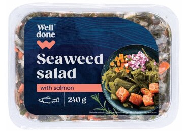 Marineeritud merikapsas 40% (merikapsas (Laminaria japonica) (päritoluriik – Hiina), sool, happesuse regulaator E260, säilitusaine E211), marineeritud köögiviljad (porgand, sibul, sool, happesuse regulaator E260, säilitusaine E211), rapsiõli, külmsuitsutatud Atlandi LÕHE filee 9% (Atlandi LÕHE (Salmo salar) (kasvatatud Norra kalakasvanduses), sool, suhkur), suhkur, vesi, sool, vürtsid, happesuse regulaator E260, säilitusaine E211. Võib sisaldada vähesel määral MOLLUSKEID, MUNA, SINEPIT ja SOJA. Võib sisaldada luutükke!