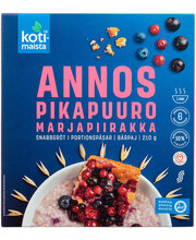 TÄISTERA KAERAHELBED, kuivatatud marjatükid 4% ﴾mustsõstar, mustikas, pohla, suhkur, päevalilleõli﴿, mustsõstrapulber 2%, vanilliinsuhkur, sool, kardemon. Võib esineda nisu, rukki ja odra jälgi. Kaera ja marjade päritolu: Soome