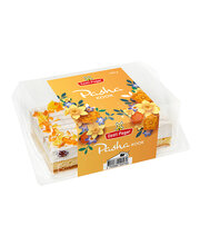 Pasha-KOHUPIIM 43% (KOHUPIIM, RÕÕSK KOOR, suhkur, rosinad, aprikoos, apelsinikoor, apelsin, modifitseeritud tärklis, paksendaja: pektiin; glükoosi-fruktoosisiirup, happesuse regulaatorid: sidrunhape, naatriumtsitraadid, kaltsiumtsitraadid; lõhna- ja maitseaine, toiduvärv: karoteenid), NISUJAHU, pirni-õunatäidis (suhkur, pirn, õun, vesi, modifitseeritud tärklis, paksendaja: gellankummi, happesuse regulaator: sidrunhape, säilitusaine: kaaliumsorbaat, lõhna-ja maitseained, tardaine: kalitsiumtsitraat, toiduvärv: karoteenid), vesi, vahukreem (PETT, taimsed õlid (palmituum, kookos, raps, palm), täielikult hüdrogeenitud palmituumaõli, modifitseeritud tärklis, emulgaatorid: E472b, E435, E433; lõhna-ja maitseained, stabilisaator: karrageen, toiduvärv: beetakaroteen), suhkur, margariin (palmirasv, vesi, rapsiõli, emulgaator: E471, sool, happesuse regulaator: sidrunhape), KOGUMUNAMASS, šokolaadikrussid (suhkur, kakaovõi, TÄISPIIMAPULBER, VADAKUPULBER, LAKTOOS, emulgaator: letsitiin, lõhna- ja m