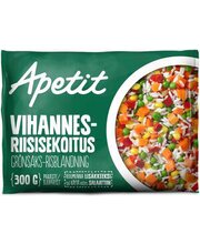 riis, hernes, porgand, mais, paprika. Köögivilju 56% ja riisi 44%