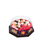 rõõsk koor (KOOR, stabilisaator: karrageen), vahukreem (PETIPIIM, taimeõlid (palmiseeme, kookos, palm, raps), täielikult hüdrogeenitud palmiseemneõli, modifitseeritud tärklis, emulgaatorid: E472b, E435, E433; lõhna- ja maitseaine, stabilisaator: E407; toiduvärv: E160a), KOHUPIIM 13%, suhkur, mandariinitäidis 8% (mandariinid 60%, suhkur, glükoosi-fruktoosisiirup, vesi, modifitseeritud tärklis, sidrunimahla kontsentraat, happesuse regulaatorid: E331iii, sidrunhape; paksendaja: E418; lõhna- ja maitseaine, säilitusaine: kaaliumsorbaat), virsikutäidis (virsikud, virsikumahl, suhkur, vesi, modifitseeritud maisitärklis, glükoosi-fruktoosisiirup, happesuse regulaator: sidrunhape; säilitusaine: kaaliumsorbaat; paksendaja: E418; lõhna- ja maitseaine, karamellisiirup, toiduvärv: E160a), vesi, KOGUMUNAMASS, vanillikate (suhkur, taimsed rasvad ja õlid (palm, kookos), LAKTOOS, VADAKUPULBER, emulgaatorid: letsitiin (SOJA), E492; naturaalne vanilli lõhna- ja maitseaine), kreemistabilisaator (suhkur, LAKTOOS, želatiin, dekstroos), biskviidikontsentraat (NISUTÄRKLIS, NISUJAHU, LÕSSIPULBER, emulgaatorid: E472b, E475; kergitusained: E450, E500; sool, lõhna- ja maitseaine, toiduvärvid: E160a, E101), rapsiõli, NISUJAHU (NISU, jahu parendaja: askorbiinhape), biskviidikontsentraat (NISUJAHU, maisitärklis, LÕSSIPULBER, dekstroos, musta porgandi, hibiskuse, virsiku ja mandariini kontsentraadid, sinine spirulina, maltodekstriin, ensüümid), sidrunimahl, valge glasuur (suhkur, osaliselt ja täielikult hüdrogeenitud palmiseemne rasv, VADAKUPULBER, LÕSSIPULBER, emulgaator: letsitiin (SOJA); lõhna- ja maitseaine), mandlimaitseline täidis (vesi, glükoosi-fruktoosisiirup, suhkur, modifitseeritud maisitärklis, kookosrasv, VADAK, toiduvärv: kaltsiumkarbonaat; lõhna ja maitseaine, sool, säilitusaine: kaaliumsorbaat), kirsimoos (kirsid, suhkur, tärklis, happesuse regulaator: sidrunhape; säilitusaine: kaaliumsorbaat), glükoosisiirup, kreemistabilisaator (suhkur, želatiin), valge šokolaadi puiste (suhkur,