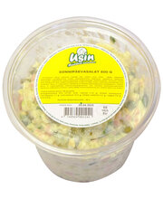 Kartul, majonees (rapsiõli, vesi, suhkur, sool (1,1%), LÕSSI-, MUNA-, SINEPIPULBER, paksendajad (modifitseeritud tärklis, ksantaankummi), happesuse regulaatorid (äädikhape, sidrunhape), säilitusained (naatriumbensoaat, kaaliumsorbaat), toiduvärv (beeta- karoteen), värske kurk, keeduvorst (vesi, sealiha 11%, kanalihamass, broileri rinnaliha 10%, kamar, veiserasv, kartulitärklis, keedusool (max 2%), SOJAVALK, lõhna- ja maitseained, stabilisaatorid (kaltsiumdivesinikfosfaat, pentakaliumtrifosfaat), lõhna-ja maitsetugevdaja (naatriumvesinikglutamaat), antioksüdant (naatriumisoaskorbaat), dekstroos, säilitusaine (naatriumnitrit)), MUNA, konserveeritud hernes, roheline sibul, sool, suhkur