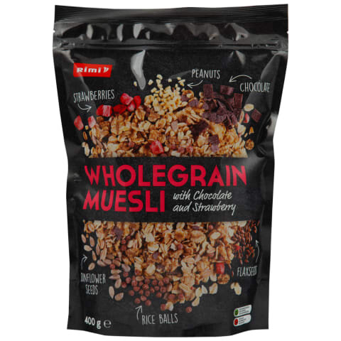 röstitud NISUhelbed (NISUhelbed, ODRAlinnaseekstrakt) 30%, täisteraKAERAhelbed 30%, täisteraRUKKIhelbed 15%, päevalilleseemned 5%, šokolaaditükid 4% (kakao sisaldus vähemalt 44%) (suhkur, kakaomass, vähendatud rasvasisaldusega kakaopulber, kakaovõi, emulgaator E322), röstitud MAAPÄHKLI tükid 4%, šokolaadilaastud 3,5% (kakao sisaldus vähemalt 50 %) (suhkur, kakaomass, vähendatud rasvasisaldusega kakaopulber, kakaovõi, emulgaator E322), riisihelbed kakaoga 3% (riisijahu, suhkur, kakaopulber, sool, looduslik lõhna- ja maitseaine), tatrahelbed, sublimeeritud maasikatükid 1%, röstitud linaseemned 1%, kakaopulber. Helveste päritolu: EL