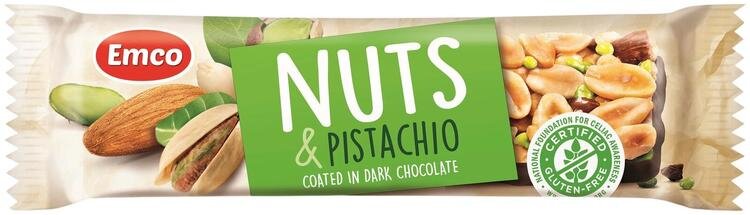 Röstitud maapähklid 39 %, röstitud mandlid 12,8 %, invertsuhkrusiirup, tume šokolaad 12 % (suhkur, kakaovõi, vähendatud rasvasisaldusega kakaopulber, kakaomass, emulgaator (rapsiseemne letsitiin), vanilliekstrakt), maltoossiirup, röstitud pistaatsiapähkel 5 %, ekstrudeeritud teraviljad (maisijahu, riis, suhkur, sool), dekstroos, õiemesi 2,4 %, riisijahu, emulgaator (rapsiseemne letsitiin), sool. Toode võib sisaldada soja, piima ja teisi pähkleid. Säilitada kuivas ning kaitsta kuumuse eest