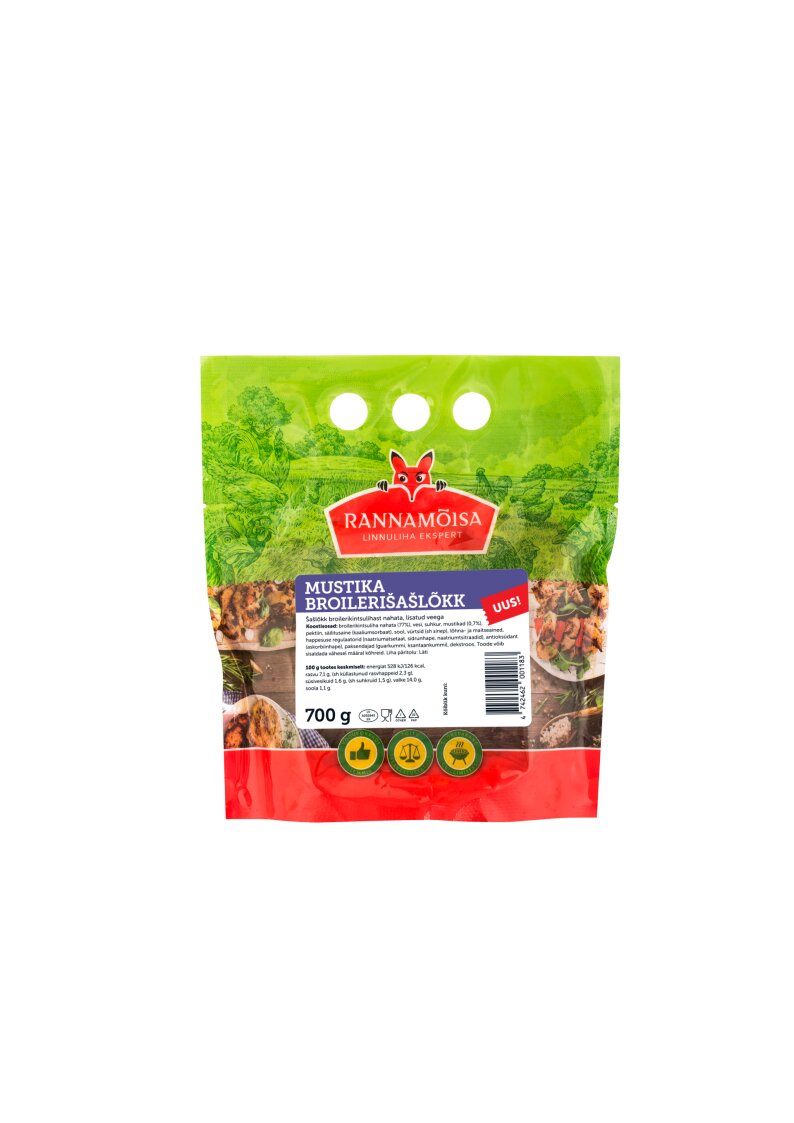 Broilerikintsuliha, nahata 77%, vesi, suhkur, mustikad 0,7%, pektiin, säilitusaine (E202), sool, vürtsid (sisaldab SINEPI), lõhna- ja maitseained, happesuse regulaatorid (E262, E330, E331), antioksüdant askorbiinhape, paksendajad (guar- ja ksantaankummi), dekstroos. Võib sisaldada kõhre.