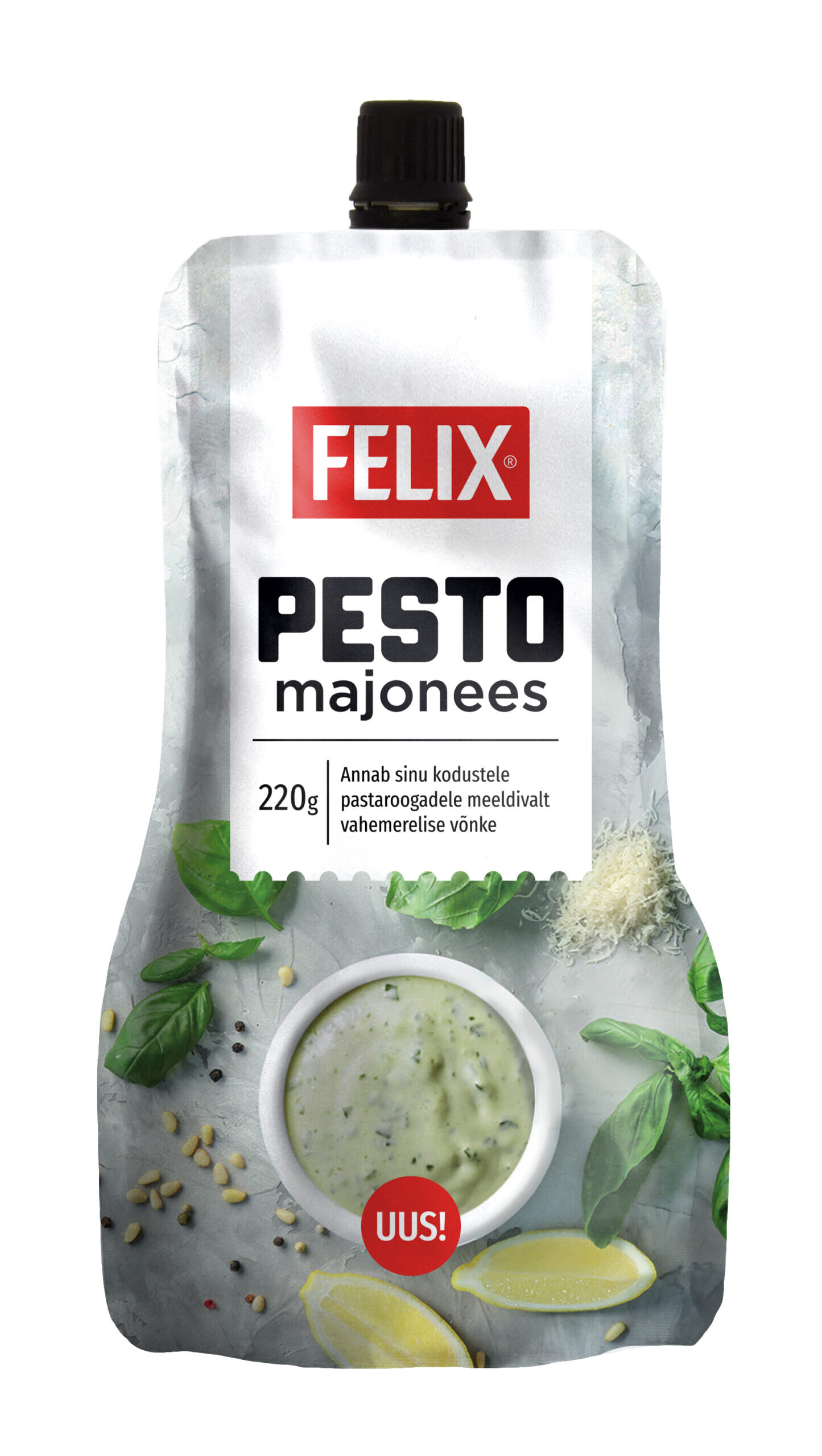 Rapsiõli, joogivesi, pesto 3% (basiilik, päevalilleõli, kõva JUUST, joogivesi,suhkur, kartulihelbed, pecorini JUUST, küüslaugu pasta), suhkur, MUNAKOLLASEPULBER, modifitseeritud tärklis, piiritusäädikas, sool, KOOREPULBER, paksendajad (guarjahu, ksantaankummi), happesuse regulaatorid (PIIMHAPE, sidrunhape), sibulapulber, küüslaugupulber, säilitusaine (E202), antioksüdant (E385).