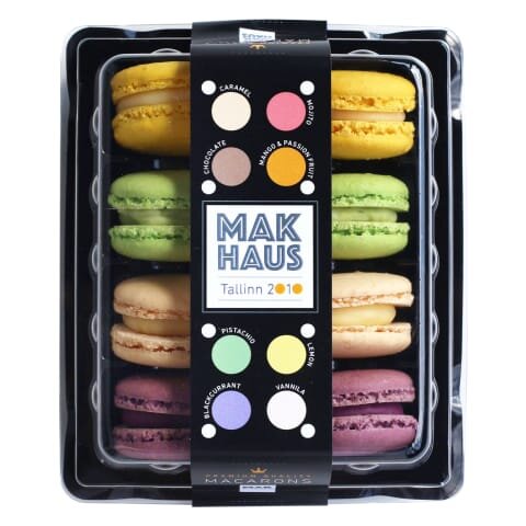 suhkur, valge šokolaad (suhkur, kakaovõi, TÄISPIIMApulber, emulgaator SOJALETSITIIN, looduslik vanilje lõhna- ja maitseaine), vahuKOOR 35%, stabilisaator karraginaan, MANDLIjahu, MUNAvalge (pastöriseeritud ja jahutatud MUNAvalge 90%, vesi, säilitusaine kaaliumsorbaat, happesuse regulaatorid: piimhape, naatriumtsitraat; stabilisaatorid: ksantaankumm), mustsõstrapüree, sidrunipüree, KOOREVÕI 82,5%, PISTAATSIA pasta (suhkur, röstitud PISTAATSIAPÄHKLID, SOJAÕLI, röstitud SOJAjahu, VADAKUpulber, emulgaator SOJALETSITIIN, täielikult hüdrogeenitud palmiõli, toiduvärv riboflaviin, lõhna- ja maitseaine, toiduvärv E141), želatiin