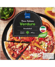 NISUJAHU, tomatipüree, grillitud köögivili (15%) (suvikõrvits (Itaalia), baklažaan (Itaalia), punane ja kollane paprika (Hispaania), oliiviõli, küüslauk), riivitud taimerasvavalmistis (12%) (vesi, kookosõli, modifitseeritud kartulitärklis, kartulitärklis, sool, toiduvärv (E160a), lõhna- ja maitseained, säilitusaine (E200)), vesi, maitsestatud tomat (6%) (kirsstomat, oliiviõli, petersell, sool, küüslauk), punane sibul (2%), porrulauk (2%), oliiviõli, tomatipüree, sool, sibul, pärm, pune, küüslauk, basiilik, pipar. Võib sisaldada vähesel määral PIIMA ja SOJA.