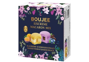 Mangojäätis (35%) passioniviljamaitselise täidisega (10%), pealt ja alt ümbritsetud makrooni stiilis värvilise mandlitaignaga (55%), Koostis: suhkur, vesi, 13,2% mangopüree, 9,2% MANDLIJAHU, NISUJAHU, VÕI, LÕSSIpulber, KANAMUNA, MUNAvalgepulber, glükoosisiirup, maisitärklis, niiskusesäilitajad: glütseriin, želatiin (sealiha), sool, vaniljekauna ekstrakt, stabilisaator: pektiinid, modifitseeritud tärklis, hapendaja: sidrunhape, paksendaja: Jaanikaunakumm, värvus: karoteen, lõhna- ja maitseained, emulgaatorid: rasvhapete mono- ja diglütseriidid, rasvhapete mono- ja diglütseriidide piimhappeestrid, rasvhapete mono- ja diglütseriidide sidrunhappeestrid; Happesuse regulaator: naatriumtsitraat. Võib sisaldada MAAPÄHKLITE ja SEESAMI jälgi. Mustikamaitseline jäätis (35%) šokolaadimaitselise täidisega (10%), pealt ja alt ümbritsetud makrooni stiilis värvilise mandlitaignaga (55%), Koostis: Suhkur, vesi, 9,2% MANDLIJAHU, NISUJAHU, VÕI, LÕSSIpulber, KANAMUNA: valgupulber, maisitärklis, glükoosisiirup, 0,71%. Mustikamahla kontsentraat, 0,5% kakaopulber, želatiin (sealiha), sool, modifitseeritud tärklis, invertsuhkrusiirup, värvaine: porgandimahla kontsentraat, hibiski kontsentraat, musta porgandi ekstrakt, Jenipapo ekstrakt, hapendaja: sidrunhape, Stabilisaator: pektiinid, antioksüdant: askorbiinhape, värvus: ehtne karmiin, lõhna- ja maitseained, emulgaator: rasvhapete mono- ja diglütseriidid. Võib sisaldada MAAPÄHKLITE ja SEESAMI jälgi.