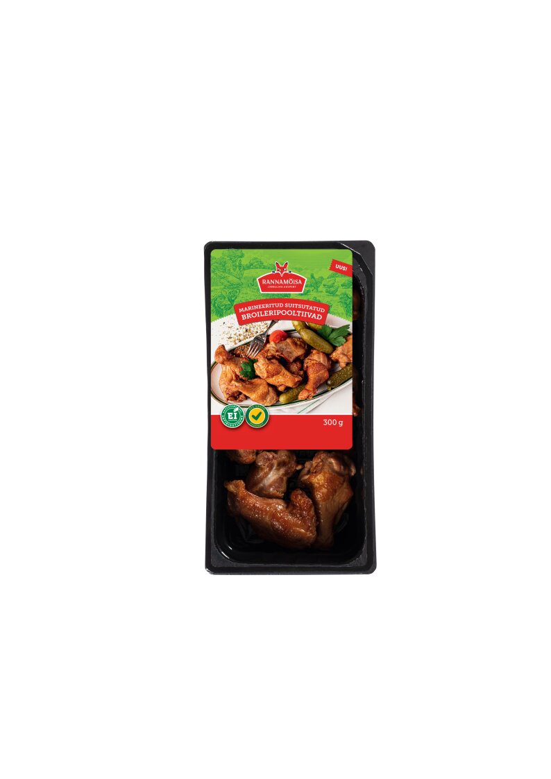 broileripooltiivad (97%), sool, äädikhape (0,6%), dekstroos, stabilisaator (trifosfaadid), paksendajad (töödeldud Eucheuma merevetikad, ksantaankummi, guarkummi), glükoosisiirup, vürtsiekstraktid (must pipar, tšillipipar). Liha päritolu: Läti* Toote koostisosade loetelu võib muutuda. Kontrollige enne toote tarbimist pakendil esitatud koostisosi.