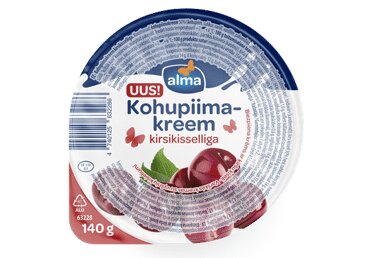 KOHUPIIMAKREEM* 50% (KOHUPIIM*, suhkur, vanill, vanilliin, paksendaja (pektiin), happesuse regulaator (sidrunhape), toiduvärv (karoteenid)), kirsi kissell 50% (vesi, suhkur, kirss 8%, modifitseeritud tärklis, toiduvärv (peedipunane), happesuse regulaatorid (naatriumtsitraadid, sidrunhape), lõhna- ja maitseained).