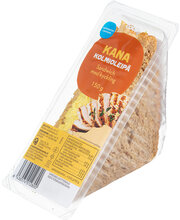 Tera- ja linnaseleib (55%) (NISUJAHU, vesi, linnastatud NISUhelbed, NISU- ja rukkiterad, NISUkliid, pärm, sool, äädikas, NISUvalk, linnastatud odra- ja NISUJAHU, rapsiõli, taimne rasv (palm, rüps)), täidis (45%) (broileriliha meemarinaadis (broilerifilee (23%) (Rootsi), rapsiõli, vesi, tomat, suhkur, äädikas, SINEP (SINEPISEEMNED, toiduvärvid (E150a, E160a), valge pipar, lõhna- ja maitseaine), KANAMUNAKOLLANE, modifitseeritud maisitärklis, sool, maitseained (sh karri), säilitusained (E202, E211), paksendaja (E415), happesuse regulaator (E330), lõhna- ja maitseained). Võib sisaldada SEESAMISEEMNEID. Suure soolasisaldusega.