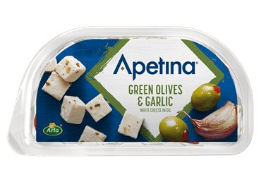 JUUST ( pastöriseeritud PIIM, sool, juuretis, mikrobioloogiline laap, tardaine E509, ensüüm lipaas), rapsiõli (18,6%), küüslauk (10,1%), täidetud rohelised oliivid (rohelised oliivid 84%, paprika mass (paprika, säilitusained: E401, E412)) (10,1%), vürtside- ja küüslaugusegu.