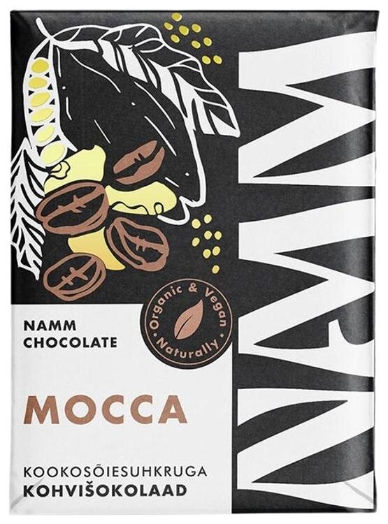 kakaovõi*, kookosõiesuhkur*, INDIA PÄHKEL*, kakaopulber*, kohviuba* (1,5%), vanilje*. (*mahepõllumajandusest). Kakao sisaldus vähemalt 46%. Võib sisaldada jääke PÄHKLITEst (metsa-, maa- ja indiapähkel, MANDEL).* Toote koostisosade loetelu võib muutuda. Kontrollige enne toote tarbimist pakendil esitatud koostisosi.