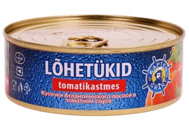Atlandi LÕHE tükid (Salmo salar) 60%, kala sisaldus vähemalt 138g; tomatikaste 40% (tomatipasta 22%, joogivesi, suhkur, rapsiseemneõli, happesuse regulaator -äädikhape, sibulapulber, tšillipipra pulber, koriander).