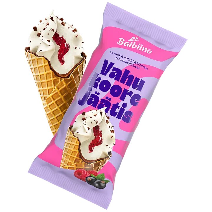 Vahukoorejäätis 62% (vesi, VAHUKOOR 22%, suhkur, LÕSSIPULBER, VÕI, VADAKUPULBER, stabilisaatorid: jaanileivapuujahu, guarkummi; emulgaator: rasvhapete mono- ja diglütseriidid, lõhna- ja maitseained: vanilli, vanilliin), vahvel 21% (NISUJAHU, suhkur, emulgaator: letsitiin, kookosõli, kartulitärklis, sool), vaarika-mustasõstratoormoos 10% (suhkur, vaarikad 30%, mustad sõstrad 25%, vesi, tsitruskiud, happesuse regulaator: sidrunhape), glasuur 5% [taimne rasv (sheaõli, rapsiõli, kookosõli), suhkur, kakaopulber, emulgaator: letsitiin], PIIMAšokolaaditükid 2% (suhkur, kakaovõi, piimapulber, kakaomass, looduslik vanilli lõhna- ja maitseaine).* Toote koostisosade loetelu võib muutuda. Kontrollige enne toote tarbimist pakendil esitatud koostisosi.