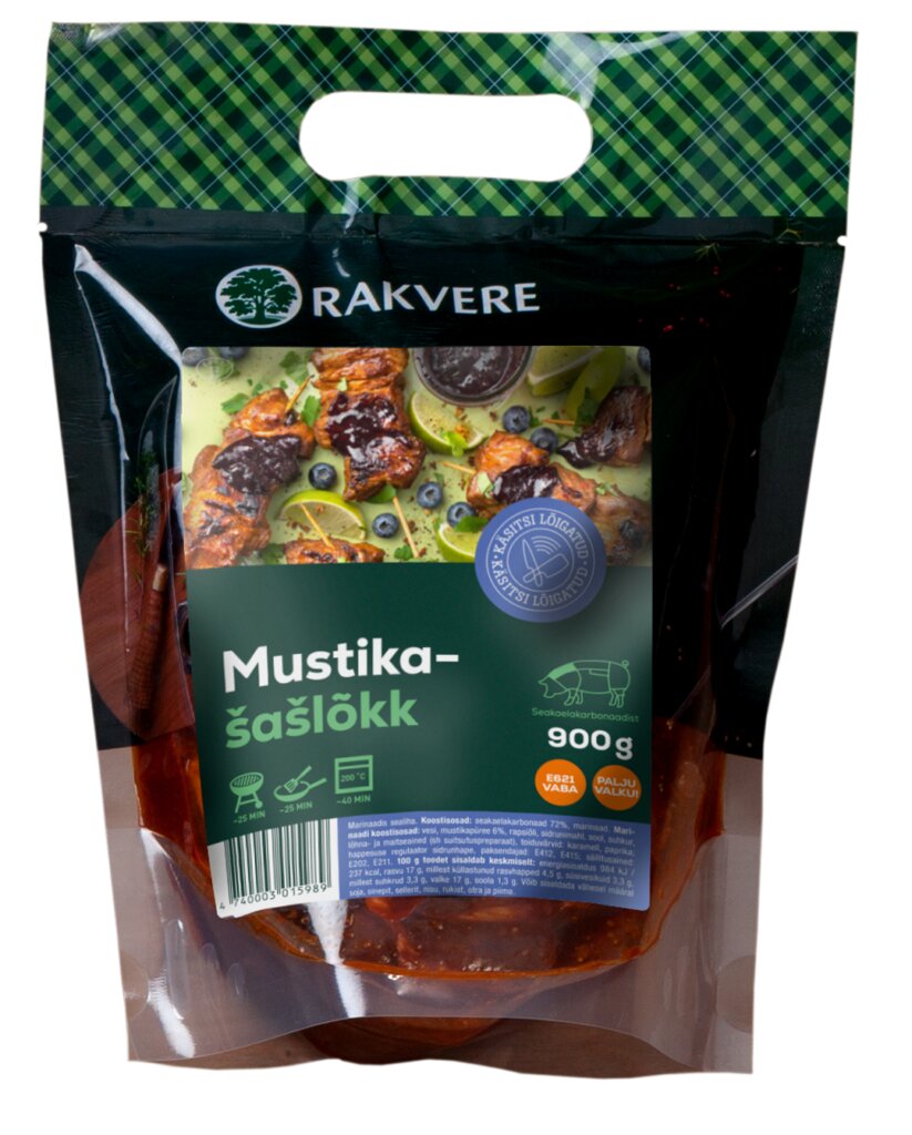 Sea kaelakarbonaad 72%, vesi, mustikapüree 6%, rapsiõli, sidrunimahl, sool, suhkur, lõhna- ja maitseained (sh suitsutuspreparaat), t oiduvärvid: karamell, paprika; happesuse regulaator sidrunhape, paksendajad: E412, E415; säilitusained: E202, E211. Võib sisaldada vähesel määral SOJA, SINEPIT, SELLERIT, NISU, RUKIST, OTRA ja PIIMA.