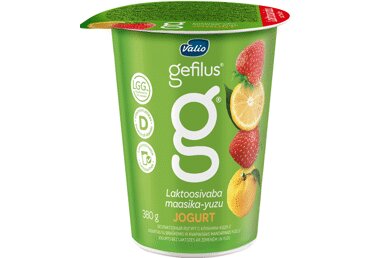 PIIM, suhkur, maasikad 2,5%, yuzu mahl 0,13%, modifitseeritud tärklis, želatiin, paksendajad (pektiinid, guarkummi), lõhna- ja maitseaine, porgandikontsentraat, happesuse regulaatorid (sidrunhape, naatriumtsitraadid, kaltsiumtsitraadid), toiduvärv (peedipunane), juuretis, Lactobacillus rhamnosus GG 5x107 cfu/g, D-vitamiin (*20% päevasest võrdluskogusest).