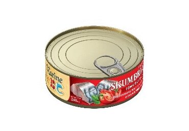 SKUMBRIA (ehk MAKRELL), tomatikaste (joogivesi, tomatipasta, suhkur, rapsiõli, maisitärklis, sool, maitseained, happesuse regulaator: äädikhape, paksendajad: guarkummi, ksantankummi; paprika ekstrakt.