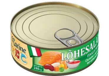 Atlandi LÕHE 19% (Salmo salar, kasvatatud: Norra kalakasvandus), valgetw ja punaste ubade segu, vesi, porgand, suhkur, roheline hernes, tomatipasta, mais, keedusool, rapsioli, maisitärklis, sibul, SELLER, happesuse regulaator: äädikhape, karri, punane pipar, paksendajad: guarkummi ksantaankummi, tšillipipar.