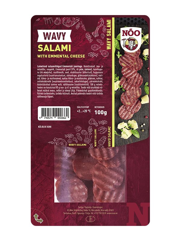 Sea- ja veiseliha, seapekk, Emmentali JUUST (9%, sh PIIM, LAKTOOS), kuivikupuru (sh NISUJAHU), sealihavalk, sool, stabilisaator (difosfaat), happesuse regulaatorid (naatriumatsetaat, sidrunhape, glükoondeltalaktoon), vürtsid, lõhna- ja maitseained, suitsu lõhna- ja maitseaine, glükoos, suhkur, antioksüdandid (naatriumisoaskorbaat, askorbiinhape), pärmiekstrakt, hüdrolüüsitud taimne valk, säilitusaine (naatriumnitrit). 100 g valmistootes on kasutatud 85 g sea- ja 41 g veiseliha. Toode võib sisaldada vähesel määral MUNA, SELLERi ja SINEPi jälgi. Toitumisalane teave 100 g tootes keskmiselt: energiasisaldus 1828 kJ/441 kcal, rasvad 37 g, millest küllastunud rasvhapped 15 g, süsivesikud 1 g, millest suhkrud 0,2 g, valgud 26 g, sool 3,1 g. Pakendatud gaasikeskkonda. Valmis tarbimiseks, tarbida külmalt. Avatud pakendis toodet võib tarbida säilivusaja lõpuni. Säilitustemp +2 …+20 °C, 70 päeva* Toote koostisosade loetelu võib muutuda. Kontrollige enne toote tarbimist pakendil esitatud koostisosi.