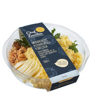 Munapuder 32% (KOGUMUNAMASS), munamajonees 32% (MUNA 65% (happesuse regulaator E330), majonees (rapsiõli, vesi, suhkur, MUNAPULBER, modifitseeritud maisitärklis, sool, paksendajad E415, E412, E410, happesuse regulaator E260, toiduvärv E160a, säilitusaine E211)), MUNA 15%, kuumsuitsuforell 15% (FORELLIFILEE (EL ja muu kui EL)), salat frillis, petersell. Tootes sisalduv muna on pärit puurivabadelt kanadelt