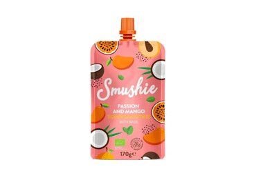 Ökoloogiline pirnipüree, ökoloogiline mangopüree (14%), ökoloogiline apelsini viljaliha, ökoloogiline ploomipüree (12%), ökoloogiline kookosjook (kookospähkli ekstrakt, vesi) (10%), ökoloogiline banaanipüree, ökoloogiline passionivilja mahl (1%), ökoloogilised õlisalvei seemned (0,8%), ökoloogiline basiilik (0,06%).