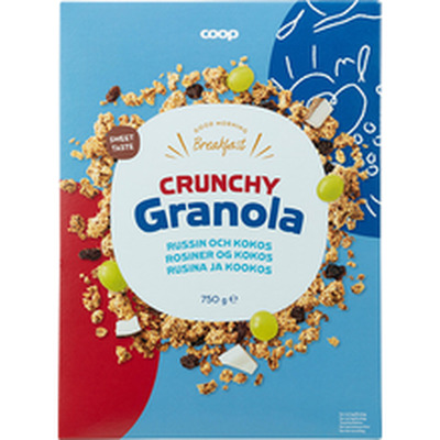 Müsli täisterahelvestest, rosinatest 25%, viigimarjadest 8%,sarapuupähklid 4%, banaanilaastudest 2% ja kookoslaastud 2% 750g